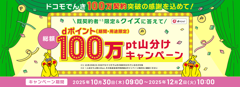 株式会社NTTドコモ(以下、ドコモ)が提供する「ドコモでんき」の契約数が2025年10月20日(月)に100万契約を突破しました。これに加え、光ブロードバンドサービス「ドコモ光」が今年で10周年を迎えたことを記念し、「ドコモでんき100万契約突破記念×ドコモ光10周年記念キャンペーン」と「ドコモでんき100万契約突破記念!クイズに答えて総額100万ポイント山分けキャンペーン」の2つのキャンペーンを2025年10月30日(木)から開催します。