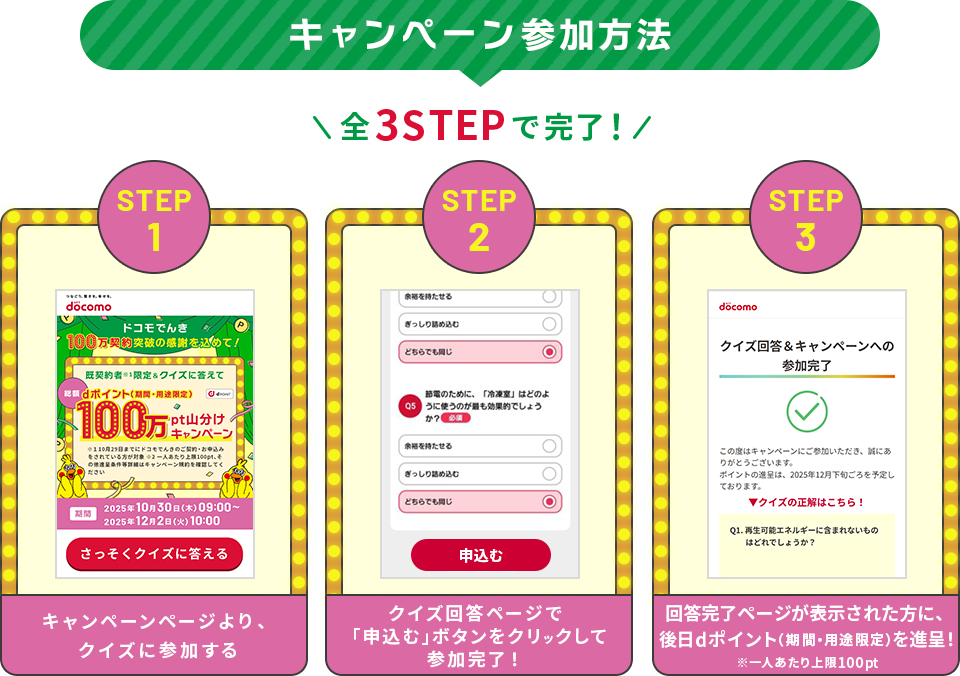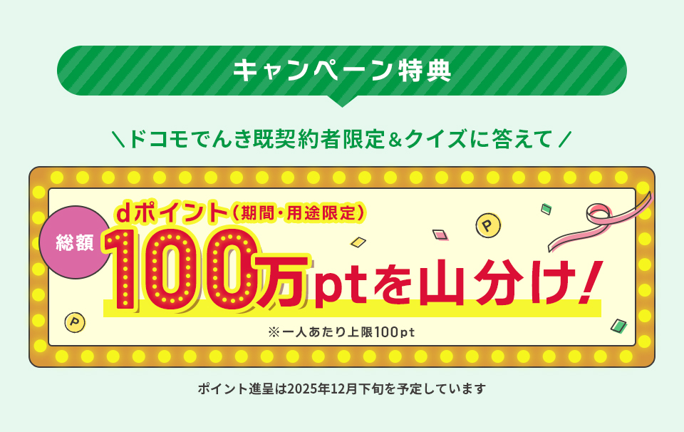 - ・クイズの回答は「ドコモでんき」の1契約あたり、1回まで可能です。